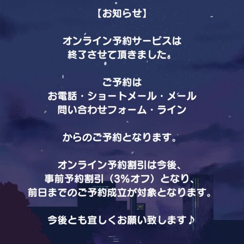 お疲れ様です♪ さて、X(旧ツイッター)でポストさせて頂きましたが、オンライン予約は誠に勝手ながら終了させて頂きました。 今後はお電話、メール、ショートメールなどでご予約くださいませ。 ラインで繋がっているかたは、ラインでも大丈夫です✨ 併せて…